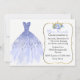 Glamorosa invitación a la fiesta de cumpleaños de Quinceanera con gráficos de un brillante vestido azul periwinkle, sobre un fondo blanco. En la parte derecha de la invitación, un espacio de texto decorativo con motivos dorados está decorado con una corona dorada de flores azules en la parte superior. La parte trasera de las invitaciones se hace con un toque dorado. Personalice el texto para el día especial de su hija.
