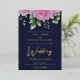 Fondo azul oscuro y oro, Relieve metalizado rosa dorado o plateado grabado color de agua rosas rosa rosadas diseño de la plantilla de invitación a la boda listo para su personalizar. Este elegante diseño de invitación a la boda de Relieve metalizado incluye rosas y texto escrito a mano. Puede personalizar esta invitación con sus propios detalles y colores.