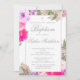 Una invitación al bautismo floral rosa bonito. El diseño es floral rosa con un texto de color plateado que se cambia fácilmente a tu información. Elija entre una gama de tipos de papel. El reverso tiene un patrón floral rosado y una cruz con su propio nombre personalizado.