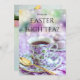 Invitación de cumpleaños al estilo británico o invitación a brunch de Pascua o té alto con un té colorido en el anverso y elegantes flores de tulipán primaveral en el reverso