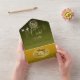 invitación con elegante textura verde degradado y foto de pareja y palomas con anillos y sombrilla con el texto dorado para una simple boda.