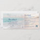 Invitación a la boda todo en uno de los destinos de la playa que parece un billete de avión de pases de embarque, con una sección que los invitados CORTAN y envían de vuelta como una tarjeta postal RSVP. Una magnífica foto verde azulada, de melocotón y rosa de la puesta de sol del océano está al fondo con un sutil diseño de hojas de palma. *No se necesita ningún sobre RSVP adicional para que los huéspedes envíen las tarjetas de vuelta. La porción de la tarjeta de respuesta de autoenvío requiere un envío postal más barato, ahorrándole toneladas en sus invitaciones de boda casuales en la playa. Se les dejará un "stub" de boletos para que se atengan a toda la información importante para su boda, incluyendo los detalles de viaje o alojamiento que aparecen en la parte de atrás. Cada parte de esta plantilla de invitación a bodas de playa puede editarse, a partir de los tipos de letra, los colores de texto y la ubicación, sólo tiene que hacer clic en 'personalizar más adelante' para utilizar el editor avanzado. Póngase en contacto con el Diseñador de Zazzle para obtener ayuda sobre personalizaciones detalladas o elementos coincidentes si necesita ayuda.
