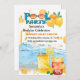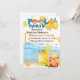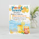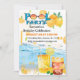 Invitación a la fiesta de natación tropical con temática de cumpleaños que incluye refrescantes bebidas tropicales, naranjas y agua salpicada