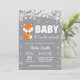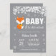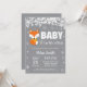 Invitación a hacer Snowflake en Baby Shower, Fox Winter. Copo de nieve blanco. Beba su frío fuera de la invitación de Baby Shower. Invitación a Baby Shower de chico o Chica. Invitación Baby Shower de feriado de invierno. Fondo gris. Para una mayor personalización, haga clic en el botón "Personalizar" y utilice nuestra herramienta de diseño para modificar esta plantilla.