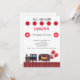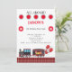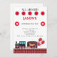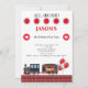 Invitación a la fiesta de cumpleaños del tren infantil. Rojo, blanco y negro. Fondo blanco.