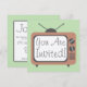 Una invitación con el ilustracion de un televisor retro de color malva con acentos grises. Fondo verde. En el lado opuesto hay un fondo verde. Personalice con detalles de su ocasión dentro de un marco gris.