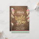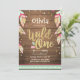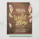 (H) ¡Una manera perfecta de invitar a sus invitados a la fiesta de cumpleaños de su pequeña! El tema de Wild One, con plumas, tribales, boho en colores rosa, coral, menta y oro. Perfecto para una fiesta de primer cumpleaños para un chica. En un fondo de madera para un ambiente rústico.