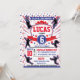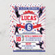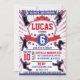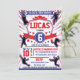 Prepárate para celebrar tu pequeña fiesta de cumpleaños Ninja con esta invitación temática "American Ninja Warrior". **Este diseño tiene un patrón de estrella trasera. Con siluetas azules, blancas, rojas y masculinas en acción en el Campo Ninja! El diseño trasero también está disponible. Diseñado por invitecentral.com