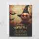 Esta invitación a la fiesta de Halloween presenta un diseño espeluznante y espeluznante centrado en un siniestro payaso con cara de calabaza. La inquietante cabeza de calabaza tallada del payaso está coronada por un gorra negro, dándole una apariencia ominosa y misteriosa. La sonrisa en la cara de la calabaza es retorcida y amenazante, con ojos brillantes que aumentan la vibración espeluznante. El fondo es un bosque oscuro y espeluznante con árboles negros y retorcidos que parecen estar cerca de la figura, lo que añade un ambiente inquietante. El esquema de color combina negros profundos y oscuros con tonos naranjas que complementan la cara de calabaza, creando una escena realmente espeluznante. En la parte superior del frente, la leyenda dice: "¡Te invitan a una fiesta de Halloween!" El texto es audaz y espeluznante, destacándose sobre el fondo oscuro y coincidiendo con el temática de payaso espeluznante. Debajo del pie de foto, hay espacio para detalles de personalizable como la fecha, hora y ubicación del fiesta, lo que le permite adaptar la invitación a su evento. En la parte inferior de la parte delantera hay una línea adicional para la información de RSVP, donde se pueden añadir detalles de contacto y una fecha límite de RSVP, lo que facilita la respuesta de los clientes. Las fuentes y los colores se pueden personalizar para que coincidan con el estilo, añadiendo un toque personal. El fondo de la invitación continúa con el mismo fondo oscuro del bosque, con el payaso con cara de calabaza y su gorra negro sutilmente desvanecido en el diseño. Hay espacio adicional en la parte posterior para cualquier texto adicional, donde puede incluir instrucciones adicionales, notas especiales o detalles adicionales del fiesta como "¡Prepárense para una noche de trucos y dulces!" o "¡Los disfraces son imprescindibles para un buen momento!" Esta invitación combina un temática de Halloween espeluznante con información práctica, perfecta para marcar el tono de un fiesta inolvidable.
