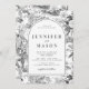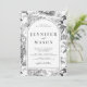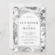 Elegante y delicado patrón de Chinoiserie con flores blancas negras primavera verano invitación clásica de boda con monograma de novias y novios en la parte trasera.