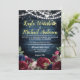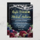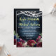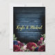 Invitaciones a una boda rústica floral de Borgoña y la Marina. Con un fondo rústico de madera oscura, flores de Merlot y flores de la marina con vegetación en el fondo. Desde la parte superior se pueden ver las luces de torbellino.