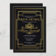 Esta invitación artística se inspira en el Roaring 20s y el Great Gatsby, y cuenta con un marco de estilo Art Déco dorado sobre un fondo de damasco negro. ¡Daisy Buchanan lo aprobaría!