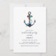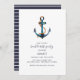 Invitaciones de anclaje náutico a una despedida de soltera impresa en la coordinación de tinta azul marino. Personalizar con la información de su fiesta. El reverso de la invitación es una franja azul marino y blanca.