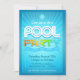 Una invitación divertida y vibrante a una fiesta en la piscina. Guay, fondo azul atractivo con elementos de diseño de sol, rayos y olas. Brillantes trozos de color de varios matices en la palabra fiesta. Personalizar con su propio texto con detalles específicos de su reunión. La luminosa y festiva piscina temática de verano invitan a tomar el sol.