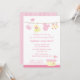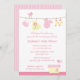 Esta ducha 5x7 tiene un tendedero en la parte superior con algunas ropas para bebés colgando de ella y un pájaro rosado parado en la fila. En la parte inferior hay un borde rosa caliente con una cesta de lavandería con una flor y un pájaro sentado sobre ella. Su información de fiesta de personalizable fácil se encuentra en el centro. Cocoa Studio