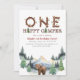 Invite a los huéspedes a una aventura de cumpleaños con esta invitación de primer cumpleaños "One Happy Camper". Diseñado con árboles forestales, tiendas de campaña y grabados estilo campamento, es perfecto para una celebración rústica, al aire libre o con temática de bosques.