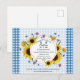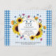 Cuidada y colorida invitación a la reunión familiar de presupuesto, con fondo azul a cuadros. Elemento de flor silvestre creativo utilizado como arreglo de flores botánicas que incluye girasol, flor de maíz y verduras. Personalice su texto para personalizar de la invitación a sus necesidades. Se puede utilizar para picnic de verano, pero también para fiestas de barbacoa, etc.