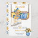 Niña sentada en un columpio amarillo y azul con tema de girasol y abeja. Úsalo para la ducha de bebé o el cumpleaños.