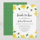 La invitación a la ducha de novia con tema de abejas con hojas verdes, mariposas amarillas y abejas pequeñas con el juego de palabras "duchemos a la novia para que se vaya". En la parte trasera hay puntos de polka verdes y blancos.
