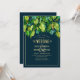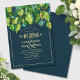 Diseño creativo boda con abundante follaje de mano dibujado a mano de manera moderna imitando la textura metálica. Tonos verdes, dorados, cobre, platino, turquesa, azul oscuro. Fondo azul profundo. Grabado dorado (el oro no es oro real, sino color). Fuentes modernas y simplificadas. Verdaderamente único, involucrado y elegante. Para bodas en otoño, bodas de verano, bodas en el jardín o cualquier tipo de boda moderna y elegante.