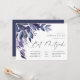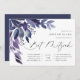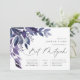 Las encantadoras invitaciones botánicas a los mitzvahs de murciélago cuentan con hojas de acuarela y follaje en tonos azul índigo y violeta, en cascada desde la esquina superior izquierda. Personalizar con sus detalles de Bat Mitzvah alineados a la derecha y adornados con caligrafía de moda. Agregue detalles adicionales, como RSVP, direcciones o estacionamiento, al reverso.