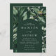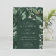 Elegantes invitaciones a bodas con detalles bodas escondidos en un marco abovedado rodeado de eucaliptos, helechos y otras ricas zonas verdes con un fondo verde oscuro. Las invitaciones a la boda en arco botánico se revierten a un sólido fondo verde oscuro. Diseñado para coordinar con nuestra colección Abundant Greenery boda.