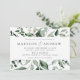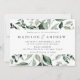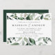 Elegantes invitaciones botánicas de bodas con lujosa vegetación acuática que bordea los detalles bodas con un fondo blanco. Las invitaciones de boda modernas y verdes se invitan a revertir para mostrar un sólido fondo verde oscuro. Diseñado para coordinar con nuestra colección Abundant Greenery boda.