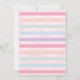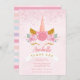 Una invitación moderna, alegre y extravagante para el primer cumpleaños, diseñada con un lindo cuerno de unicornio, pestañas amarillentas y ruidosas de color rosa y floridas y letras de caligrafía de moda del nombre del chica de cumpleaños con una espolvorea de delicado purpurina de oro rosa en el centro superior. En la parte trasera de la invitación hay unas rayas arcoíris de colores pastel.