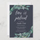 Las elegantes invitaciones botánicas de postergación de bodas cuentan con una paleta de colores de moda de verde forestal, negro oscuro y blanco crujiente. Los detalles reprogramados de los bodas están adornados con ramas verdes abundantes y hojas en un estilo acuático pintado con vibrante sobre un rico fondo oscuro.