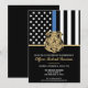 Honren la dedicación y el duro trabajo de un nuevo agente de la policía con esta invitación a graduarse de la policía personalizable. Con la insignia de la policía y la bandera de la fuerza policial con audaces franjas en blanco y negro y una orgullosa delgada línea azul, este diseño simboliza fuerza, servicio y sacrificio. La invitación se personaliza con el nombre del graduado con letras de oro, lo que lo convierte en un recuerdo memorable para amigos, familiares y colegas oficiales. Perfecto para celebrar la graduación, promoción o hito de una academia de policía en la carrera de un futuro oficial. Invite a sus invitados con estilo y muestre su apoyo al miembro más nuevo de la comunidad de la delgada línea azul.