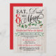 Si estás soñando con una casa abierta festiva de invierno o Navidad o una fiesta con todo el calor que viene con la temporada, entonces esta divertida invitación de fiesta "Come, Bebe & Alégrate" en grano de madera simulada pálida puede ser justo lo que necesitas. Este diseño tipográfico moderno presenta varias fuentes diferentes para la redacción "Come, Bebe & Alégrate" (NO personalizable), que también se puede aplicar a cualquier fiesta navideña o celebración de Navidad. La redacción está en negro, rojo y verde con un gran símbolo de ampersand decorativo en rojo brillante. Debajo de la redacción decorativa en la parte superior, hay una rama de hojas de acebo verdes y bayas rojas debajo. La redacción debajo de la rama se muestra actualmente con la redacción "Casa Abierta de Navidad", pero puede decir lo que necesites que diga. La cinta tipo banner verde con las palabras "CASA ABIERTA DE NAVIDAD" en negro puede decir algo más como "Fiesta de Navidad Corporativa" o "FaLaLaLaLa", etc.