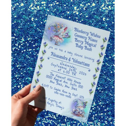 "Deseos de Arándanos y Besos de Gnomos" es una invitación que captura hermosamente la esencia de celebrar una nueva vida. Este diseño presenta nubes, tonos azules y púrpuras, lo que lo hace adecuado para una fiesta de bebé niño, mientras que las hadas niñas con faldas lindas también lo hacen apropiado para una fiesta de bebé niña. Este encantador tema de arándanos y gnomos personifica la magia de dar la bienvenida a un nuevo bebé. La deliciosa imaginería de jugosos arándanos combinada con los caprichosos gnomos crea una invitación que inspira alegría y asombro para todos los invitados. ¡Haz que tu fiesta de bebé sea inolvidable! Echa un vistazo a nuestra colección para obtener más ideas divertidas para celebrar esta ocasión especial.
