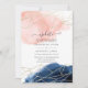 Invitación boda pospuesta con salpicaduras de color azul marino y rosa rubor y marco geométrico dorado.