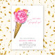 Esta ducha nupcial con tema de helados está decorada con flores acuáticas y un cono de helado. El texto dice "¡Ella ha sido descubierta!" en una tipografía elegante de escritura rosa.