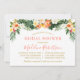La moderna y elegante acuarela Tropical Floral Bridal Shower Invitation Card incluye melocotón de coral, flores blancas, amarillas y hojas de palma de vegetación botánica de la isla. Guión de caligrafía de moda. Texto dorado. Rubor rosado de vuelta.