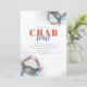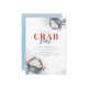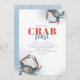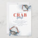 Este diseño presenta una simple invitación a un banquete azul acuático con un código QR para el sitio web, con un ícono de Facebook para la página del evento de fiesta, URL en línea con un fiesta de horneado de cangrejo acuático, un mar costero vivo, ideal para una cena fiesta de marisco, un elegante texto de tipo tipográfico de moda, una moderna tipografía de escritura caligrafía, con un estilo costero maryland New England Maine, un gran piernas ab cocidas al horno, un elegante y divertido océano de agua con un crustáceo marino azul