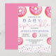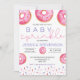 Esta ducha de personalizable para bebés cuenta con donuts color agua rosa con salpicaduras. Los colores son perfectos para una ducha de bebé.