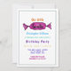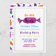 Esta encantadora y alegre invitación a la fiesta de cumpleaños con la temática de los dulces dulces es la elección perfecta para tu preciosa niñita. Cuenta con un diseño de ilustracion acuático pintado a mano. Los elementos son rosa, naranja, púrpura, verde verde azulado y caramelos amarillos sobre un simple fondo blanco. La paleta de colores utilizada es una elección popular para las niñas pequeñas, entre ellas rosa, púrpura, magenta y verde verde azulado. El color del fondo y del texto está definido, pero se puede cambiar pulsando sobre el botón "personalizar".