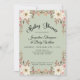 Fondo verde salado, Estilo de cabaña BOHO acuarela de diseño floral con marfil y flores rosa rubor para su ducha de bebé. En el reverso, el fondo es de madera blanca y rústica, y es muy agradable para un fiesta al aire libre de primavera, verano o otoño. Tema de la niña bebé con cálido matiz otoñal, diseño floral terrenal pintado a mano por la artista y diseñadora con licencia internacional, Audrey Jeanne Roberts, copyright.