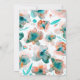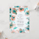 Flores de acuarela románticas invitación a la boda con corona floral verde azulada en el lado delantero y patrón de flores acuarelas en el trasero.