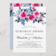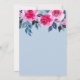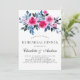 Elegante y sencillo diseño de invitación a la cena, con rosas acuarelas rosas brillantes, follaje azul y gris sobre un fondo blanco. El lado inverso de la invitación está en un color azul polvoriento.