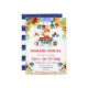 Flores amarillas, azules y rojas y diseño de Fox con globos, bordes de confeti, confeti y purpurina dorado