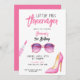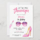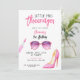 Este diseño celebra un día especial de moda con un ilustracion acuático de moda de tacón alto, lápiz labial y gafas de sol. Los colores suaves y los acentos ondulados crean un ambiente elegante y lúdico para una fiesta de tercer cumpleaños.