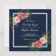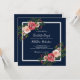 Diseño moderno de invitaciones nupciales de invierno con flores de navidad en un fondo azul marino.
