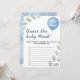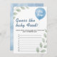 Adivinen el juego de la ducha de alimentos para bebés | Bolón Eucalyptus Greenery Baby Boy Game Cards Prepárese para un reto divertido y sabroso con nuestro Adivinar El bebé Comida Ducha Juego Globo Eucalyptus! Estas atractivas tarjetas de juego cuentan con exuberante vegetación de eucalipto y alegres globos azules, creando un entorno agradable para esta clásica actividad de la ducha de bebé. ¡Es la manera perfecta de agregar algunas risas y diversión sensorial única a tu celebración mientras los invitados tratan de identificar diferentes sabores de comida para bebés! Se supone que el juego de la comida para bebés es ideal para los anfitriones que buscan una actividad interactiva y humorística que atraiga a todos. El suave diseño de eucaliptos y globos azules lo convierte en un lugar versátil para varios temas de duchas de niños, desde botánico moderno a elegante rústico. Los clientes podrán disfrutar de olfateo y degustación (¡si se atreven!) de las diferentes guarderías de comida para bebés, lo que provoca reacciones divertidas y momentos memorables. Personaliza fácilmente estas tarjetas de juego para bebés con tus nombres, la fecha de la ducha y las instrucciones específicas para el juego. Puede personalizar los tipos de letra y la ubicación del texto para que encajen perfectamente con su visión de celebración única. Imprimidas con cartón de alta calidad, estas tarjetas de juego están diseñadas para ser un bello y funcional agregado a las actividades de la ducha de bebé, con espacio para que los huéspedes escriban sus suposiciones. conjetura juego de alimentos para bebés, juego de eucaliptos con globos, juego de alimentos para bebés con vegetación, juego de niños con eucaliptos, juego de alimentos para bebés personalizado, juego de eucalipto verde, juego de ducha para bebés