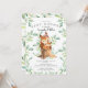 Invitación a una ducha de bebé con un bebé dulce Squirrel con mamá sentada en un trozo de árbol y enmarcada con hojas de color verde natural sobre un fondo blanco. Haga girar nuestra invitación para ver una hoja verde a juego para un toque especial.