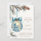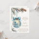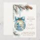 ¡Celebra la próxima llegada de tu bebé con esta impresionante invitación de baby shower con tema de país de las maravillas invernal! Con una adorable cuna azul y una mecedora dentro de un adorno navideño brillante, este diseño crea una atmósfera mágica y acogedora de invierno. Las suaves ramas de pino, piñas y una cinta azul añaden un encanto festivo, lo que la convierte en la invitación perfecta para un baby shower de invierno.