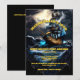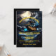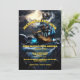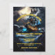 Un gráfico animado, impactante y realista de un barco pirata con una bandera de cráneo y ballesta ondeando en el cielo nocturno navegando por un mar tormentoso. Las ominosas nubes negras están cayendo sobre el rayo y el agua está brillando azul acuático contra las olas negras líquidas. Las plantillas de texto amarillo editables se colocan estratégicamente en el ilustracion para la redacción de su personalizado. Este elegante, lujoso y de gama alta es ideal para una fiesta temática de roger alegre, pirata náutico, ahoy matey o divertida fiesta de disfraces de halloween. Esto es adecuado para niños, adolescentes y adultos