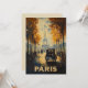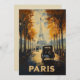 Poster de viajes de época que exhibe una romántica escena callejera de París de los años 30. La Torre Eiffel se alza con elegancia al fondo, enmarcada por árboles otoñales con hojas doradas. Los coches clásicos y las lámparas de calle bordean la carretera de adoquín húmeda, lo que cautiva el encanto de París en una época pasada. La palabra "PARÍS" aparece de manera prominente en la parte inferior en negrita, enfatizando el encanto eterno de la ciudad.