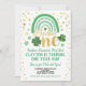 [Todo el texto es editable excepto el de Lucky ONE] Cute invitación de cumpleaños en estilo. Tema: Shamrock & Rainbow. Ocasión: Primer cumpleaños. Estilo: lindo, boho, elegante. Colores: verde, blanco, dorado. Gráficos: Arcoiris, shamrock, gorra verde, oro falso.